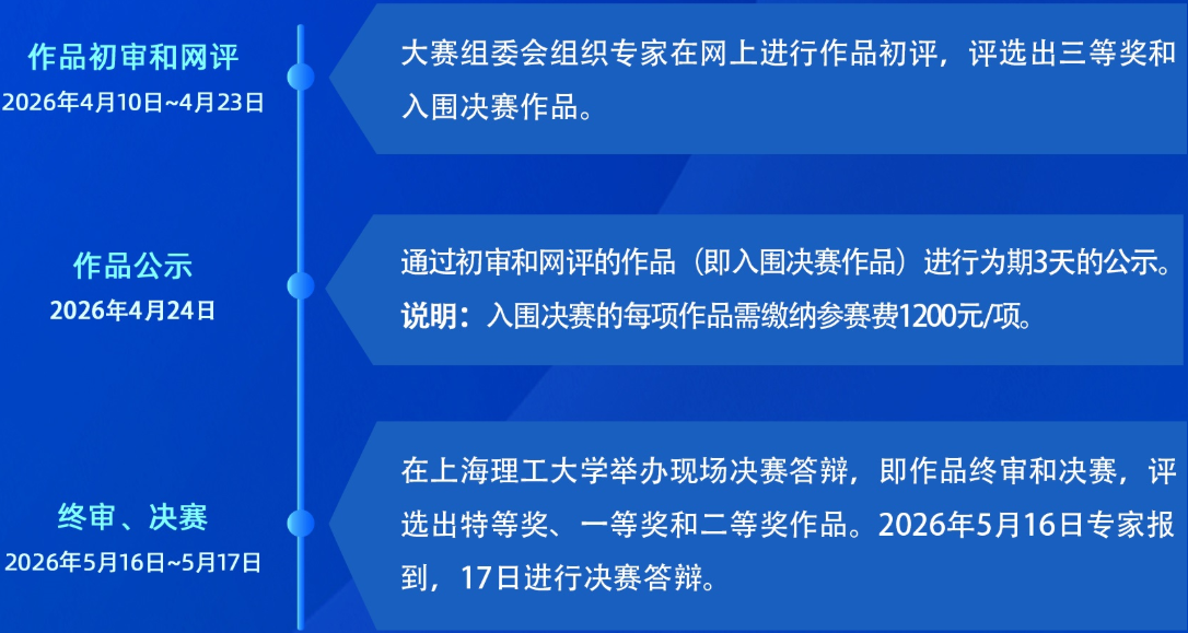 (1)参赛作品必须是当年完成的作品。参赛队伍必须在规定时间内完成作品,并按要求准时提交参赛作品,未按时提交者视为自动放弃比赛。申报书、说明书和汇总表等模板将发给各高校领队教师,官方网站(https://shjnjp.sjtu.edu.cn/#/) 将于2026年1月1日开通报名入口。
